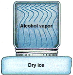 Cut the blotter paper or sponge, whichever you are using, in a circle to just fit the bottom of the jar. Use the wire to form a clip to hold the blotter in place inside the bottom of the jar. If you have trouble keeping the blotter in place with the wire, attach it with a bit of epoxy. Cut a piece of black cloth to just fit inside the jar lid. Place the radioactive source in the jar lid. Pour some alcohol in the jar. Swirl it around, soaking the blotter or sponge in the bottom. Pour out the excess alcohol. Screw the upside down jar onto the lid, leaving the radioactive sample in place on the lid. Let sit for 10 or 15 minutes. Place the jar, lid down, onto the dry ice in the pan. Be very careful not to touch dry ice with your bare hands! The alcohol should cool in 5 minutes or so. To create a good saturation zone for the alcohol, warm the top of the chamber by placing your hand on it (opposite the dry ice). Turn off the room lights, and shine a flashlight through the side. Once the jar is really cold, the alcohol will vaporize, and trails will be visible where the sub atomic particles cause it to condense. (Actually, the electrically charged particles ionize air molecules in their path, and the alcohol condenses around these ions.) Safe sources of radioactive material are available from scientific supply houses.